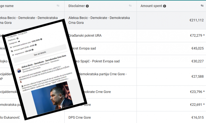 Demokratska Crna Gora je u proteklih pet godina potrošila preko 200.000 eura za reklame na društvenoj mreži Facebook, pokazuju podaci Mete. Demokrate su samo u posljednjih mjesec imale 72 oglasa za šta su izdvojili preko 4.000 eura. Među sponzorisanim objavama se našla i ona u kojoj ministar odbrane Dragan Krapović izdaje naredbu da se kompletno ljudstvo i mehanizacija vojske aktiviraju u gašenju požara - u danu kada je objavljena fotografija njegovog odmaranja na plaži.