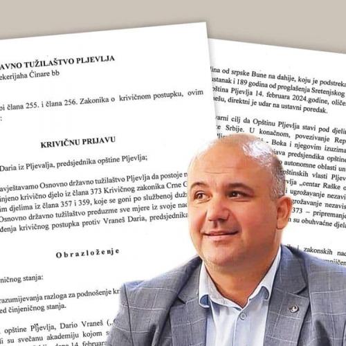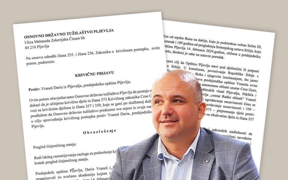 The applicants of this criminal complaint indicated that there is indisputable evidence that Vraneš, by organizing a formal academy in the Pljevlja Culture Center, in honor of another country, committed a criminal offense under Article 373 of the Criminal Code of Montenegro, and in connection with criminal offenses under Article 357 and 359, which is prosecuted ex officio.