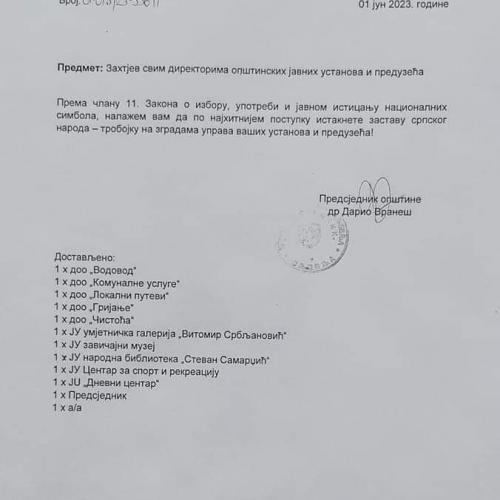 "According to Article 11 of the Law on Election, Use and Public Expenditure of National Symbols, I will promine the flag of the Serbian people - Trobikan on the buildings of your institutions and companies," said Vranaša in which victory had insight.