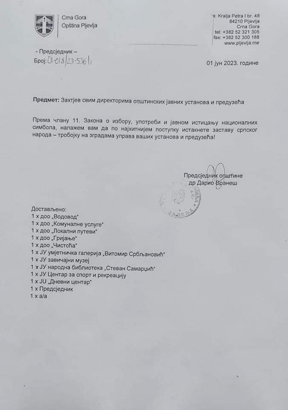 President of the Municipality of Pljevlja Dario Vraneš addressed the request to all directions of municipal public institutions and companies, to emphasize Tricolors on buildings.