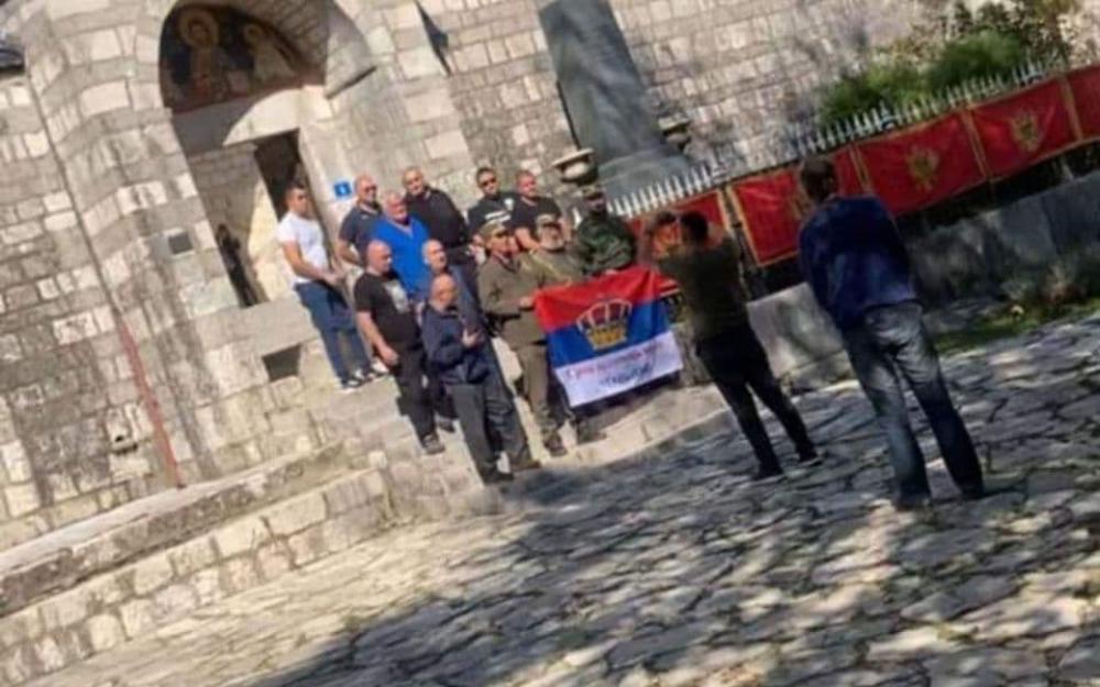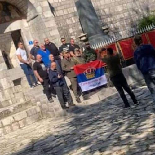 A group of citizens who call themselves the "Serbian Royal Army in the Fatherland", led by a certain Mile Pavićević Čiča, took a photo today when leaving the Cetinje Monastery with a flag on which, in addition to the crown, the name of this "organization" is written.