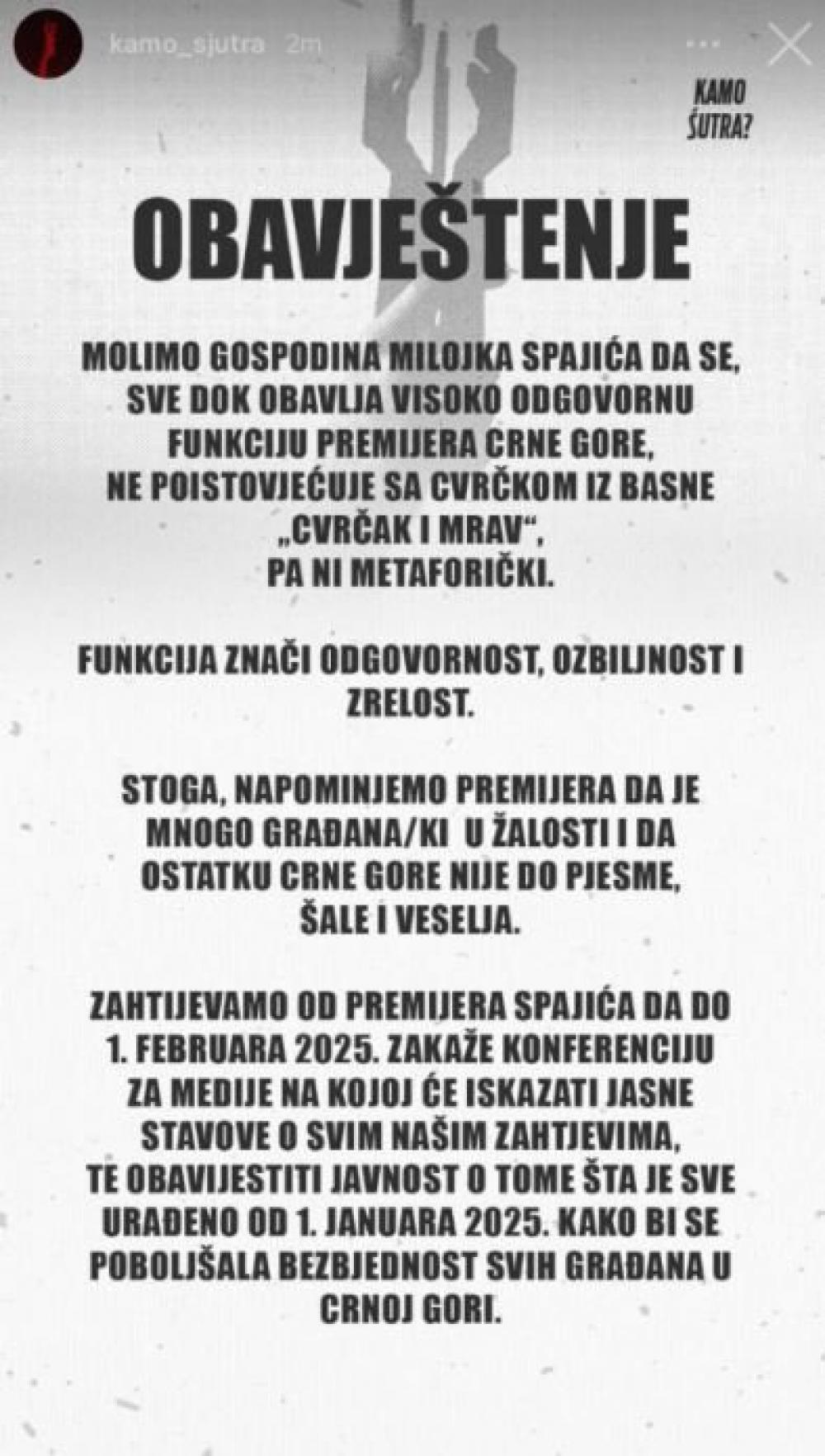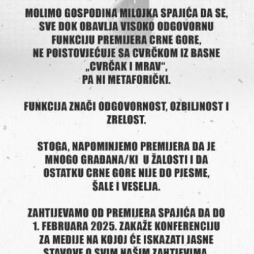 The student group "Kamo śutra" is asking Prime Minister Milojko Spajić to schedule a press conference by February 1st, at which, they say, they will express clear positions on all their demands and inform the public about what has been done since January 1st, in order to improve security.
