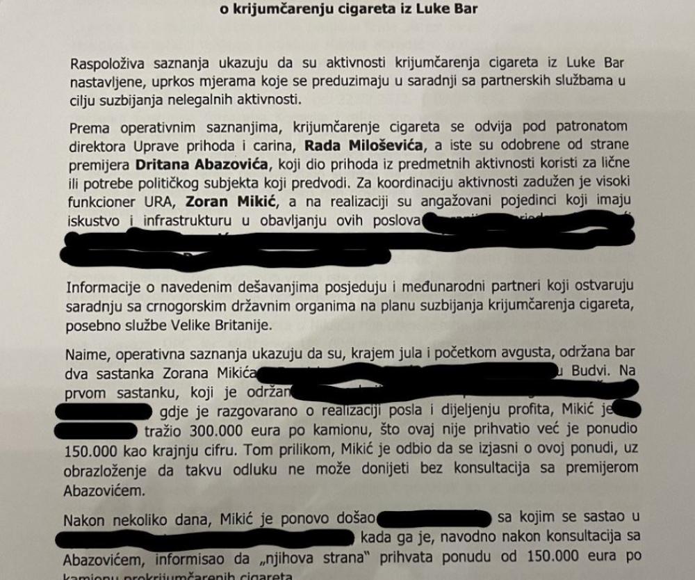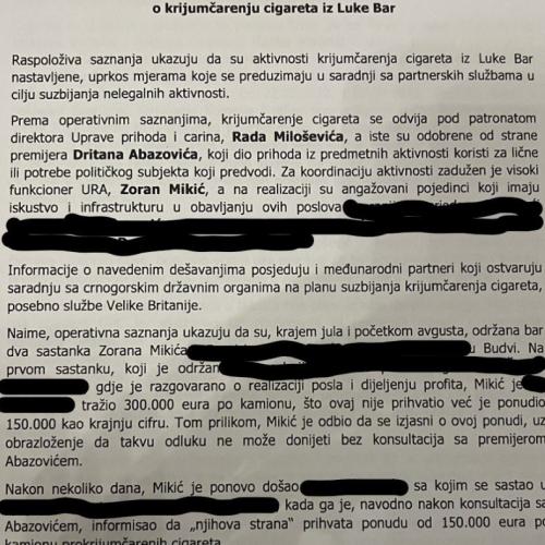 In an unnamed document published by Konjevic, "according to operational knowledge, the smuggling of cigarettes takes place under the patronage of the Director of the Administration of Revenue and Customs, Rada Milosevic, and the same were approved by Prime Minister Dritan Abazovica, which part of the revenue from the activities in question use for personal or the needs of the political entity leading. High functionist of Ur, Zoran Mikic, is in charge of the coordination of activities, and at the realization they are engaged individuals who have experience and infrastructure in doing these jobs. "