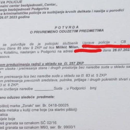 Six days after the police, during a search on July 20 regarding a false bomb report, confiscated items found in the basement of a solitaire near the hotel "Podgorica", owner Milan Milikić was finally given a "certificate of temporarily confiscated items".