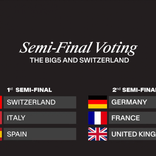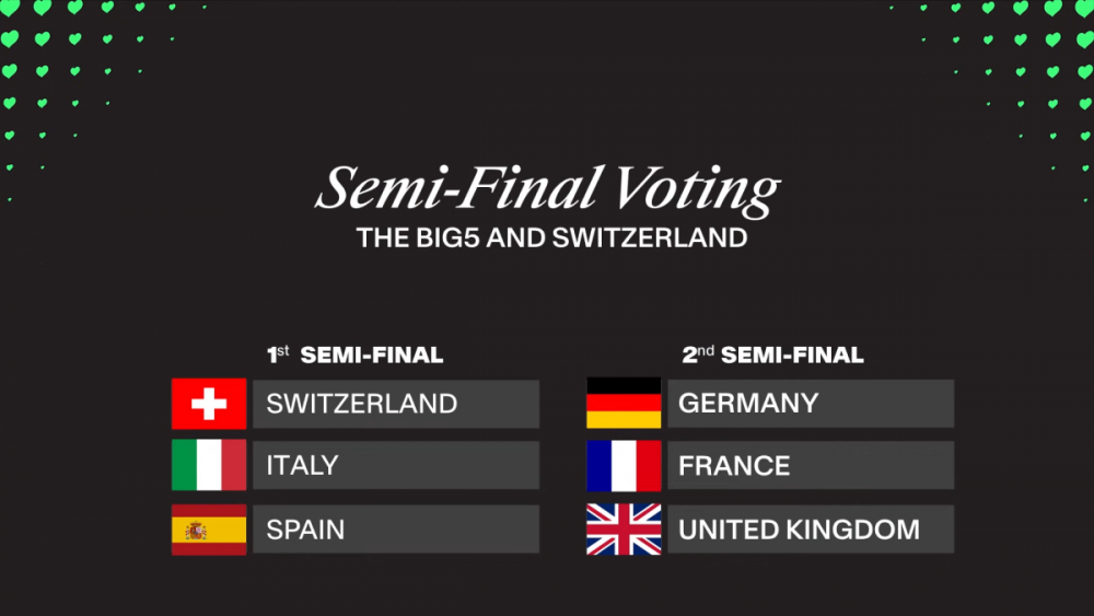 Švajcarska, kao zemlja domaćin, zajedno sa pet članica takozvanih "Velikih 5" zemalja učesnica (Francuska, Njemačka, Italija, Španija i Ujedinjeno Kraljevstvo) se ne takmiče u polufinalu, ali njihova domaća publika može da glasa jednog od njih. Prije nego što konkurentske zemlje dobiju mjesto u polufinalu, biće nasumično određeno koje od polufinala će "Velikih 5" moći da glasa.