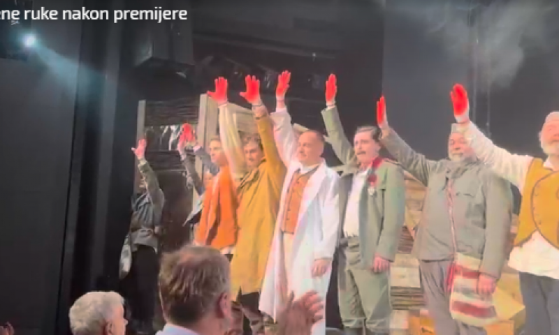 Nakon premijere predstave "Sveti Georgije ubiva aždahu" u Jugoslovenskom dramskom pozorištu u petak uveče, glumci su izašli pred publiku s rukama obojenim crvenom bojom, što je simbol protesta nakon pada nadstrešnice na Željezničkoj stanici u Novom Sadu, kada je stradalo 15 ljudi, a još dvoje je u teško povrijeđeno.